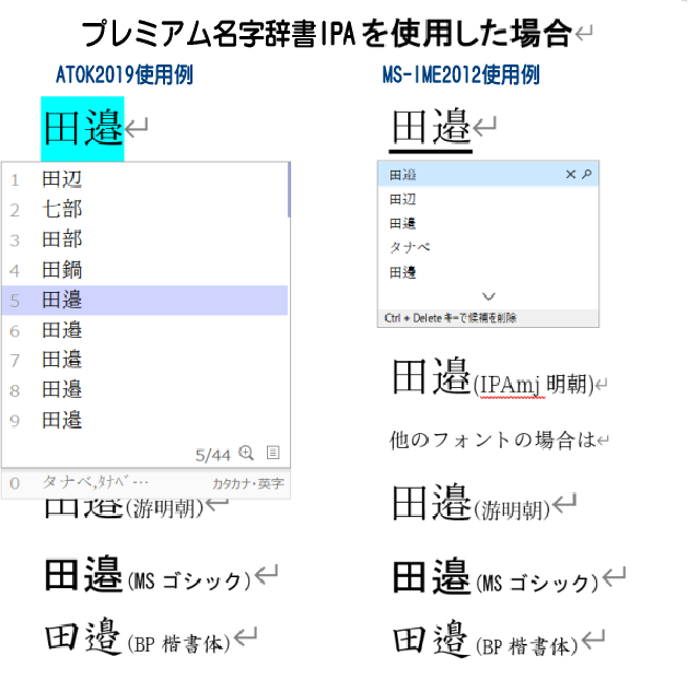 | 14万件強の名字を収録/IPAmj明朝固有の外字混じりも変換可 ※IPAmy明朝以外で使用する場合は下記右図の様に変更されます ※Windows10/11限 |