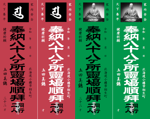 十八ヶ所オーダーメイド納め札(カラー版) 販売価格 11,000円(税込)~ 色(赤/緑/金/銀)の用紙に印刷します。 ※金・銀は特注になります。 詳しくはお問い合わせ下さい。下記より
